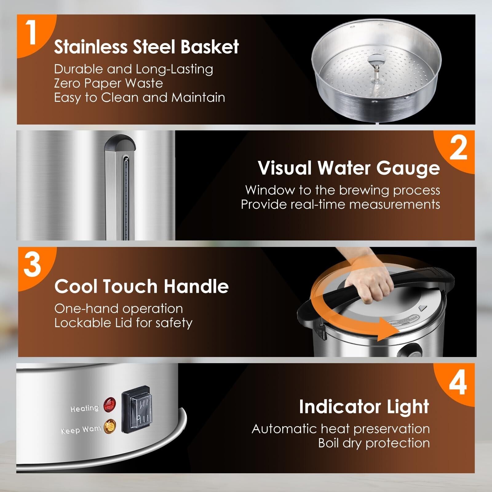 • All Stainless Steel StructureCrafted with utmost precision, the large coffee dispenser is built to last. Made from double layer high-quality stainless steel, this large coffee maker is not only efficient but also ensures that the coffee remains hot for an extended period. The sturdy construction guarantees durability, making it the perfect investment for both personal and commercial use.